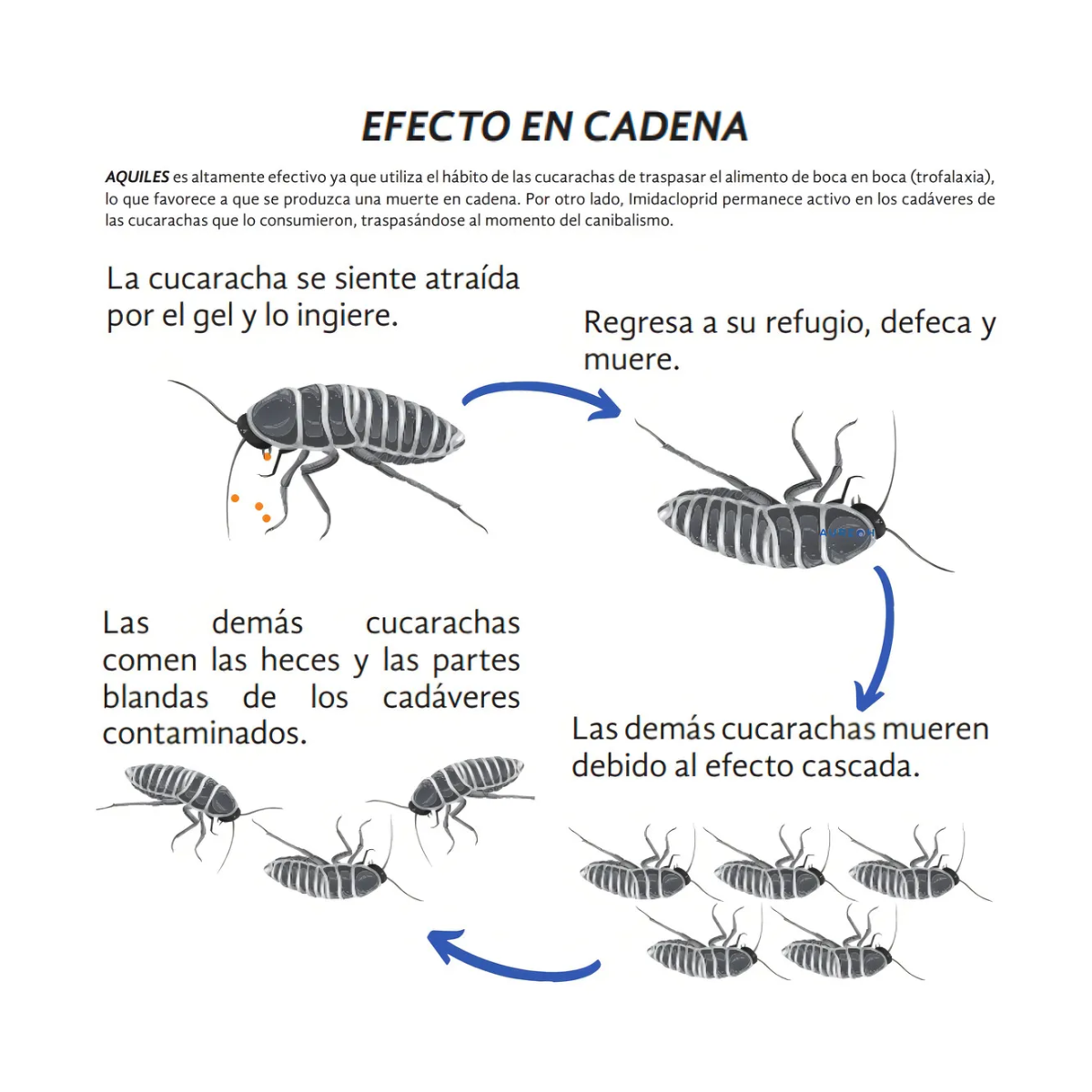 Extermina por completo las colonias de cucarachas con el gel cucarachicida Aquiles. Su fórmula irresistible con harina de pollo y glucosa es transportada al nido, activando un potente "efecto dominó" que mata por trofalaxia y canibalismo. Es la solución profesional para el control de plagas de cucaracha alemana, americana y oriental.